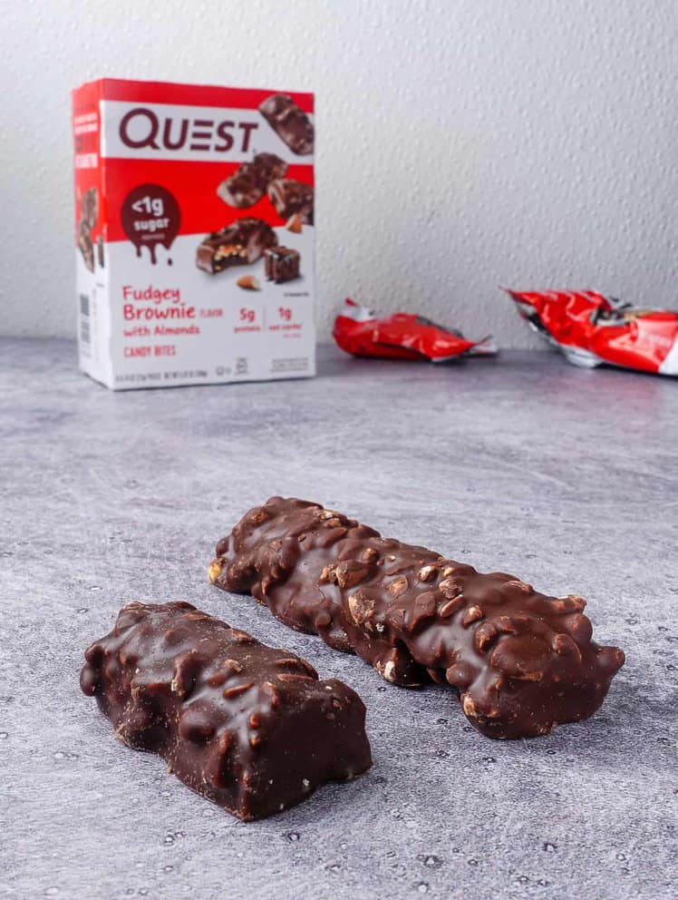 Quest offers two options: candy bites and candy bars. The candy bars are roughly the size of a typical candy bar or protein bar, and the candy bites are a little bit smaller than half of a bar.